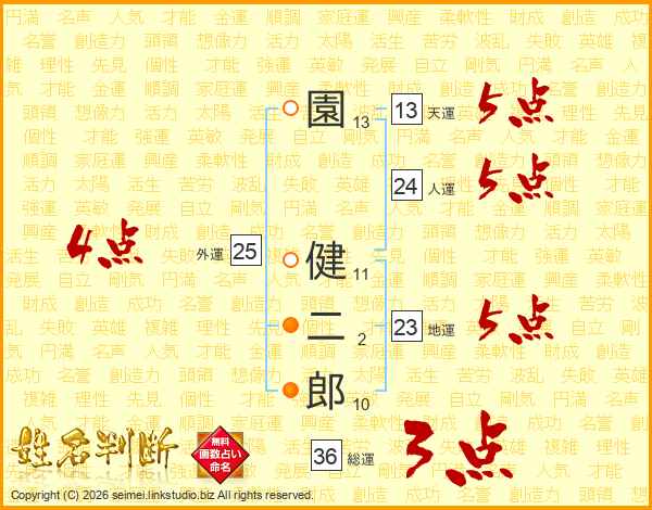 あなたの人生を表す1番重要な運勢です。生涯を通じて影響する総合運となり、主に50歳以降の晩年期に影響を及ぼします。苗字と名前の合計画数。