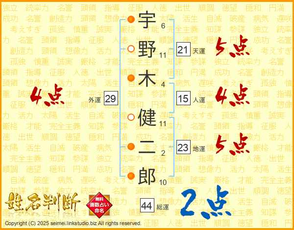 宇(6画)野(11画)木(4画) 健(11画)二(2画)郎(10画)
