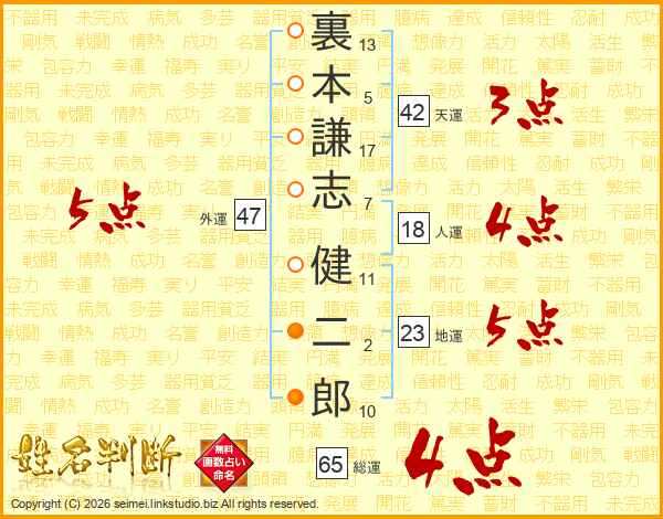裏(13画)本(5画)謙(17画)志(7画) 健(11画)二(2画)郎(10画)