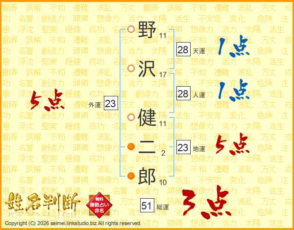 野(11画)沢(17画) 健(11画)二(2画)郎(10画)