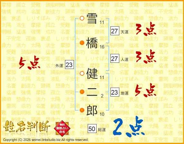 雪(11画)橋(16画) 健(11画)二(2画)郎(10画)