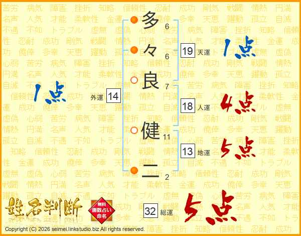 多々良健二さんの総運は32画の5点!