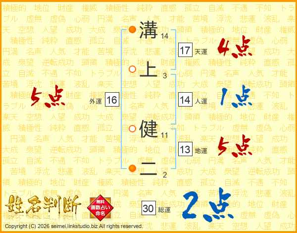生活面を象徴する運勢です。外部から受ける影響力を表し、結婚運、家庭運や職場、環境への順応性を表します。総運から人運を引いた画数。姓や名が1文字の場合を除く。