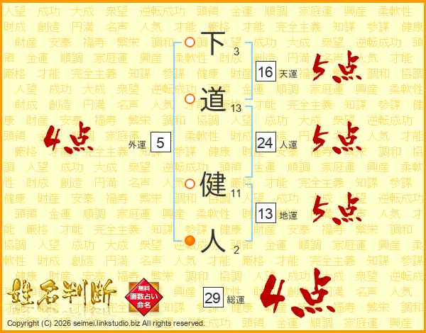 下道健人さんの総運は29画の4点!