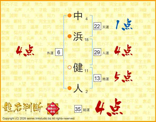 あなたの人生を表す1番重要な運勢です。生涯を通じて影響する総合運となり、主に50歳以降の晩年期に影響を及ぼします。苗字と名前の合計画数。