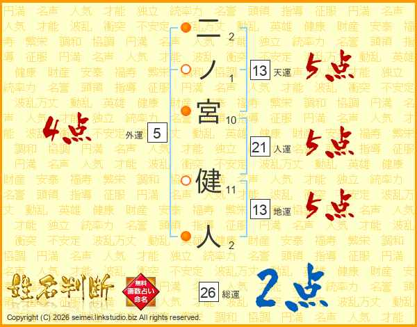 二ノ宮健人さんの総運は26画の2点!