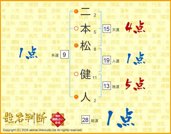 二(2画)本(5画)松(8画) 健(11画)人(2画)