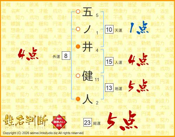 五ノ井健人さんの総運は23画の5点!