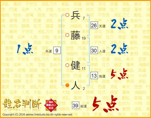 兵藤健人さんの総運は39画の5点!