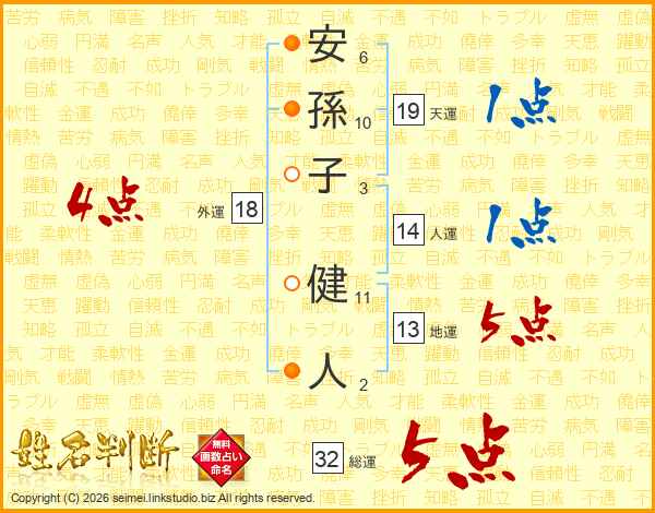 安(6画)孫(10画)子(3画) 健(11画)人(2画)