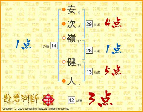 安(6画)次(6画)嶺(17画) 健(11画)人(2画)