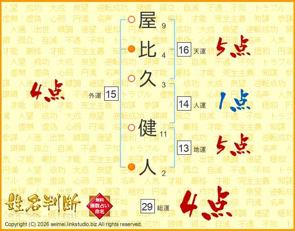 屋(9画)比(4画)久(3画) 健(11画)人(2画)