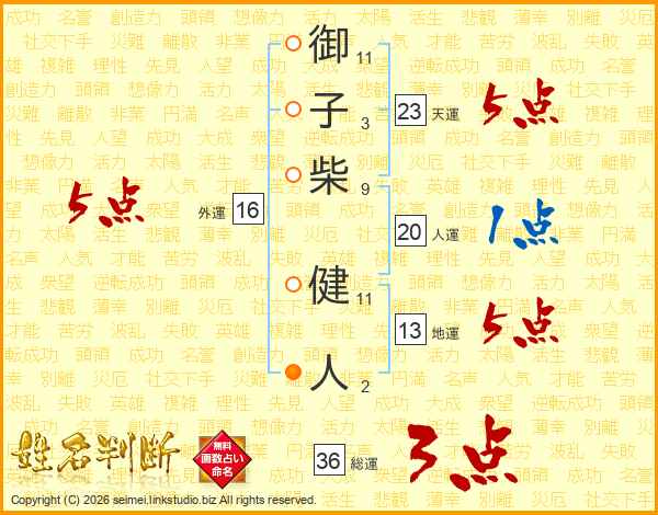 御(11画)子(3画)柴(9画) 健(11画)人(2画)