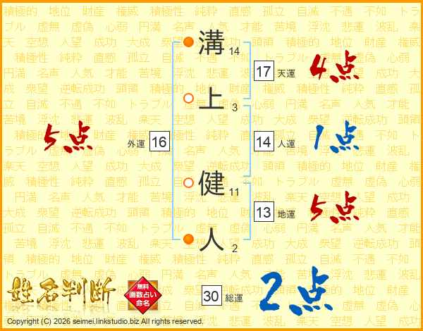 生活面を象徴する運勢です。外部から受ける影響力を表し、結婚運、家庭運や職場、環境への順応性を表します。総運から人運を引いた画数。姓や名が1文字の場合を除く。