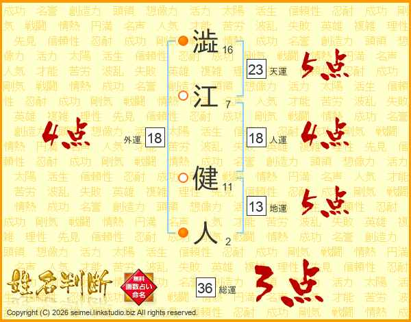 あなたの人生を表す1番重要な運勢です。生涯を通じて影響する総合運となり、主に50歳以降の晩年期に影響を及ぼします。苗字と名前の合計画数。