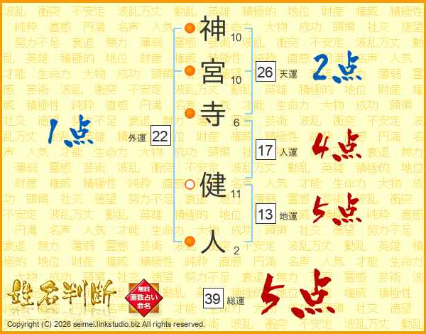 神(10画)宮(10画)寺(6画) 健(11画)人(2画)