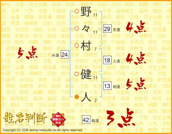 野々村健人さんの総運は42画の3点!