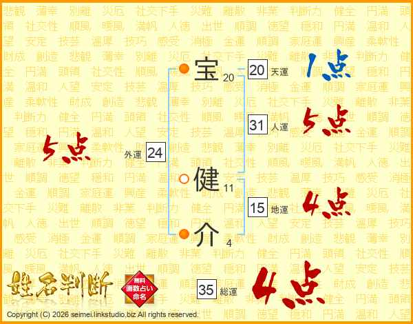 宝(20画) 健(11画)介(4画)