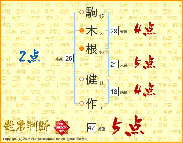 駒(15画)木(4画)根(10画) 健(11画)作(7画)