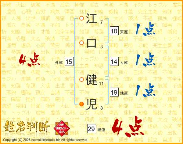 江(7画)口(3画) 健(11画)児(8画)