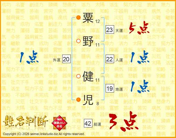 生活面を象徴する運勢です。外部から受ける影響力を表し、結婚運、家庭運や職場、環境への順応性を表します。総運から人運を引いた画数。姓や名が1文字の場合を除く。