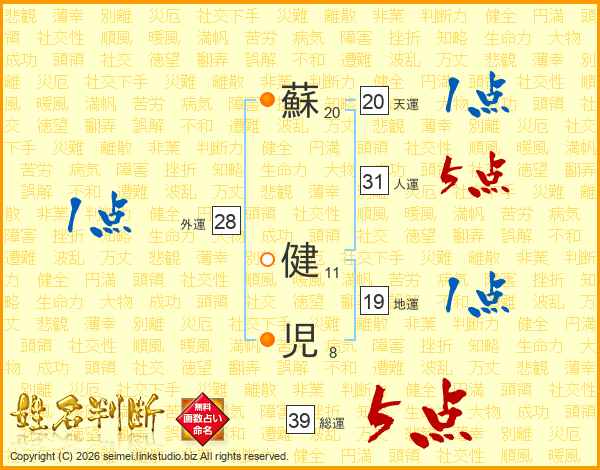 蘇(20画) 健(11画)児(8画)