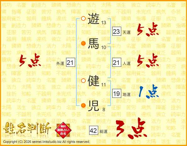 遊(13画)馬(10画) 健(11画)児(8画)