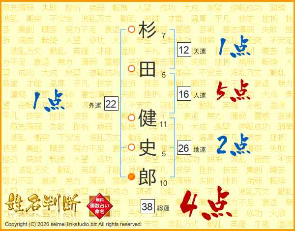 杉(7画)田(5画) 健(11画)史(5画)郎(10画)