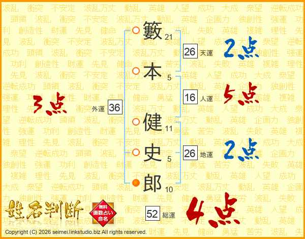 籔(21画)本(5画) 健(11画)史(5画)郎(10画)