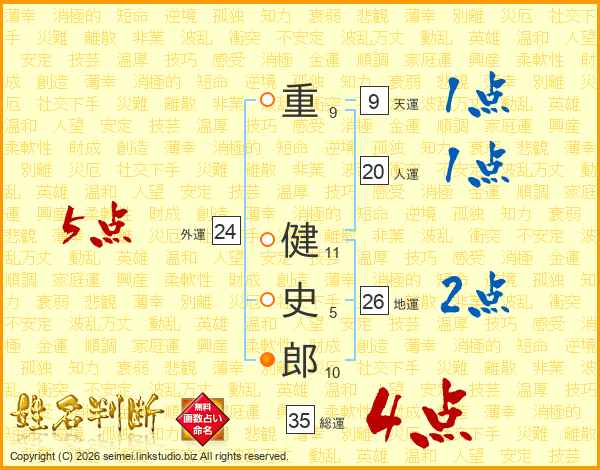 あなたの人生を表す1番重要な運勢です。生涯を通じて影響する総合運となり、主に50歳以降の晩年期に影響を及ぼします。苗字と名前の合計画数。
