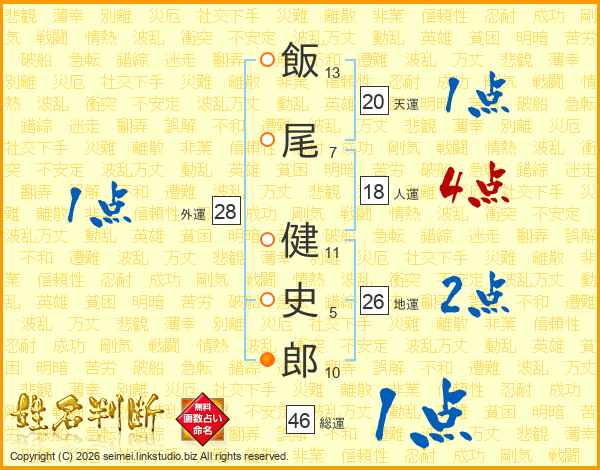 飯(13画)尾(7画) 健(11画)史(5画)郎(10画)