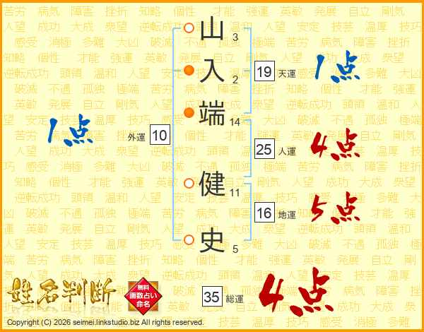 山(3画)入(2画)端(14画) 健(11画)史(5画)