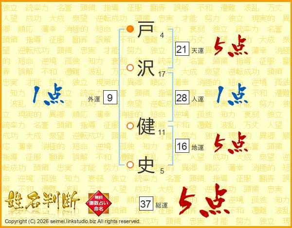 生活面を象徴する運勢です。外部から受ける影響力を表し、結婚運、家庭運や職場、環境への順応性を表します。総運から人運を引いた画数。姓や名が1文字の場合を除く。