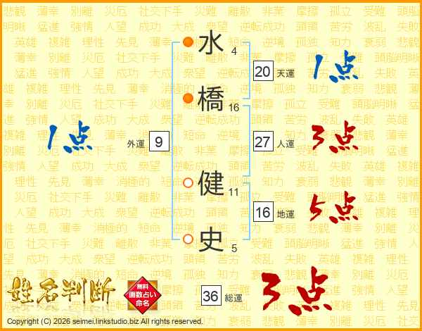 水(4画)橋(16画) 健(11画)史(5画)
