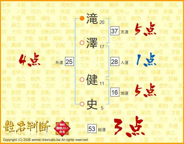 あなたの人生を表す1番重要な運勢です。生涯を通じて影響する総合運となり、主に50歳以降の晩年期に影響を及ぼします。苗字と名前の合計画数。