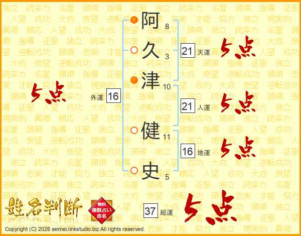 阿(8画)久(3画)津(10画) 健(11画)史(5画)