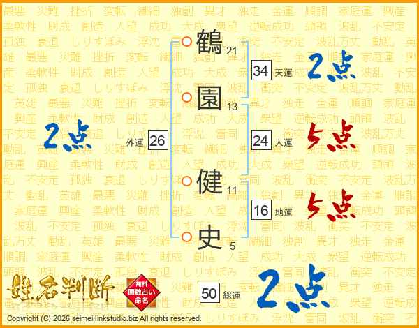 あなたの人生を表す1番重要な運勢です。生涯を通じて影響する総合運となり、主に50歳以降の晩年期に影響を及ぼします。苗字と名前の合計画数。