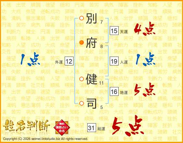 生活面を象徴する運勢です。外部から受ける影響力を表し、結婚運、家庭運や職場、環境への順応性を表します。総運から人運を引いた画数。姓や名が1文字の場合を除く。