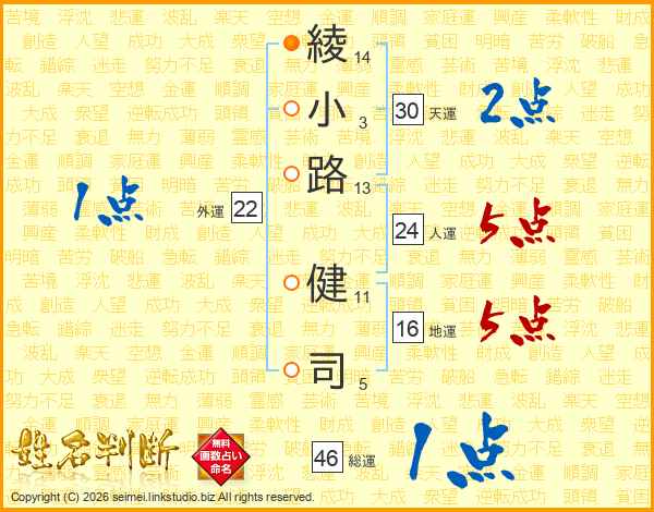綾(14画)小(3画)路(13画) 健(11画)司(5画)