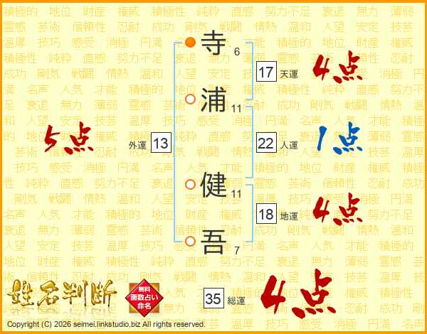 寺(6画)浦(11画) 健(11画)吾(7画)