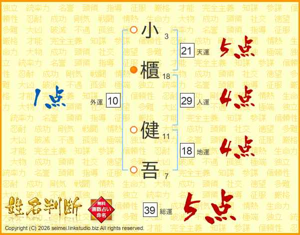 小櫃健吾さんの総運は39画の5点!