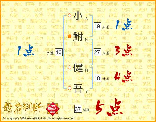 小(3画)鮒(16画) 健(11画)吾(7画)
