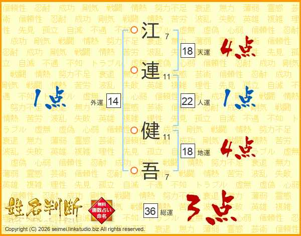生活面を象徴する運勢です。外部から受ける影響力を表し、結婚運、家庭運や職場、環境への順応性を表します。総運から人運を引いた画数。姓や名が1文字の場合を除く。