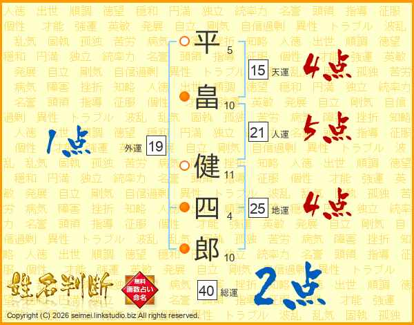 平(5画)畠(10画) 健(11画)四(4画)郎(10画)