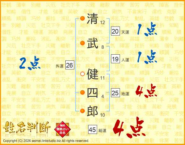 清(12画)武(8画) 健(11画)四(4画)郎(10画)