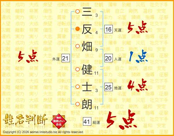 三(3画)反(4画)畑(9画) 健(11画)士(3画)朗(11画)