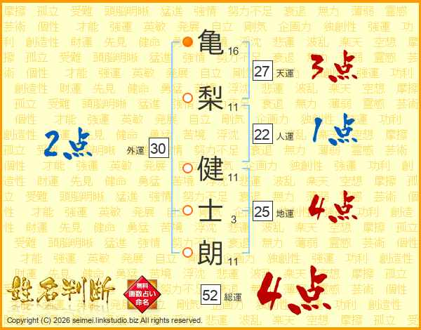 亀(16画)梨(11画) 健(11画)士(3画)朗(11画)