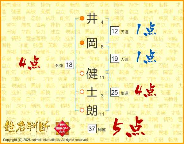 井(4画)岡(8画) 健(11画)士(3画)朗(11画)