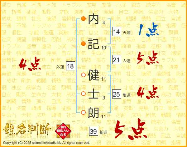 内(4画)記(10画) 健(11画)士(3画)朗(11画)