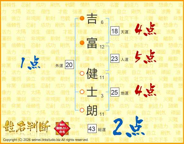 吉(6画)富(12画) 健(11画)士(3画)朗(11画)